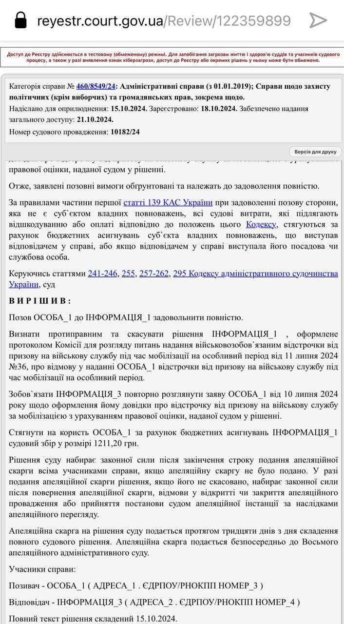 В результаті суд скасував рішення ТЦК та визнав за позивачем право на відстрочку від призову.