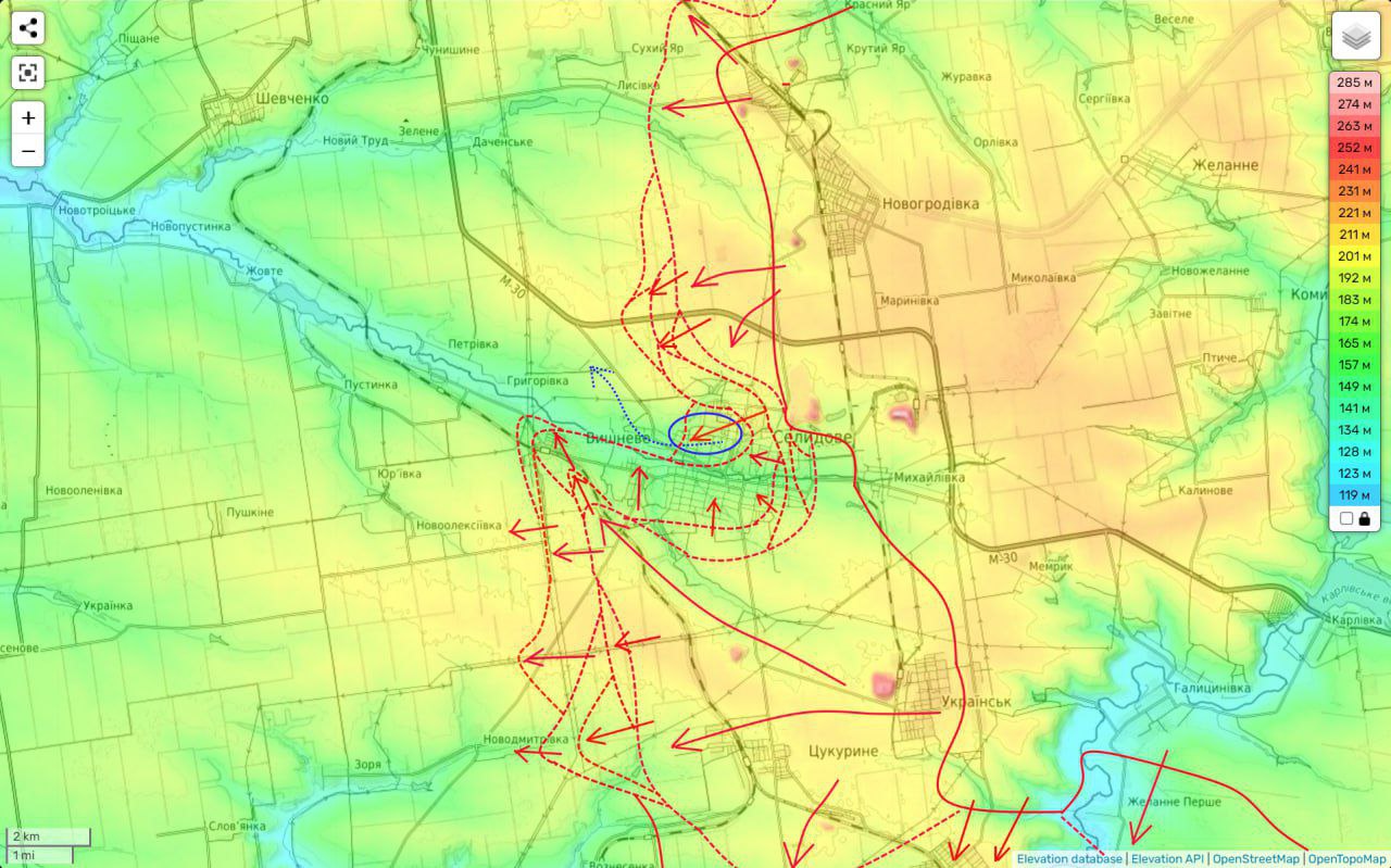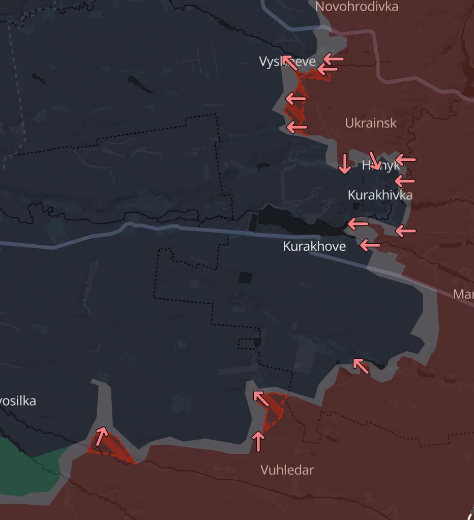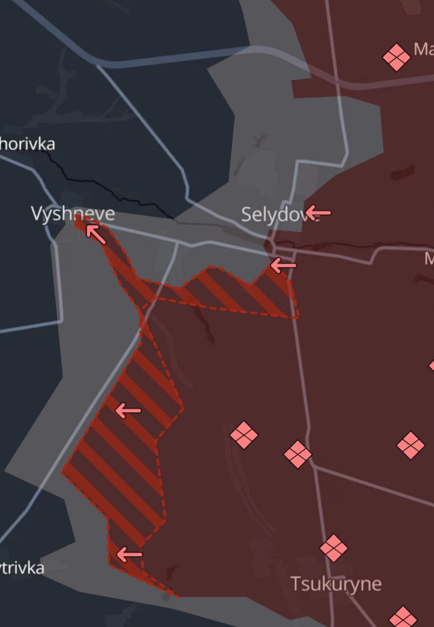 Український військовий паблік Deep State також фіксує просування РФ на захід від Селідового в районі Вишневого. При цьому українські військові заявляють, що це село зараз утримується ЗСУ.