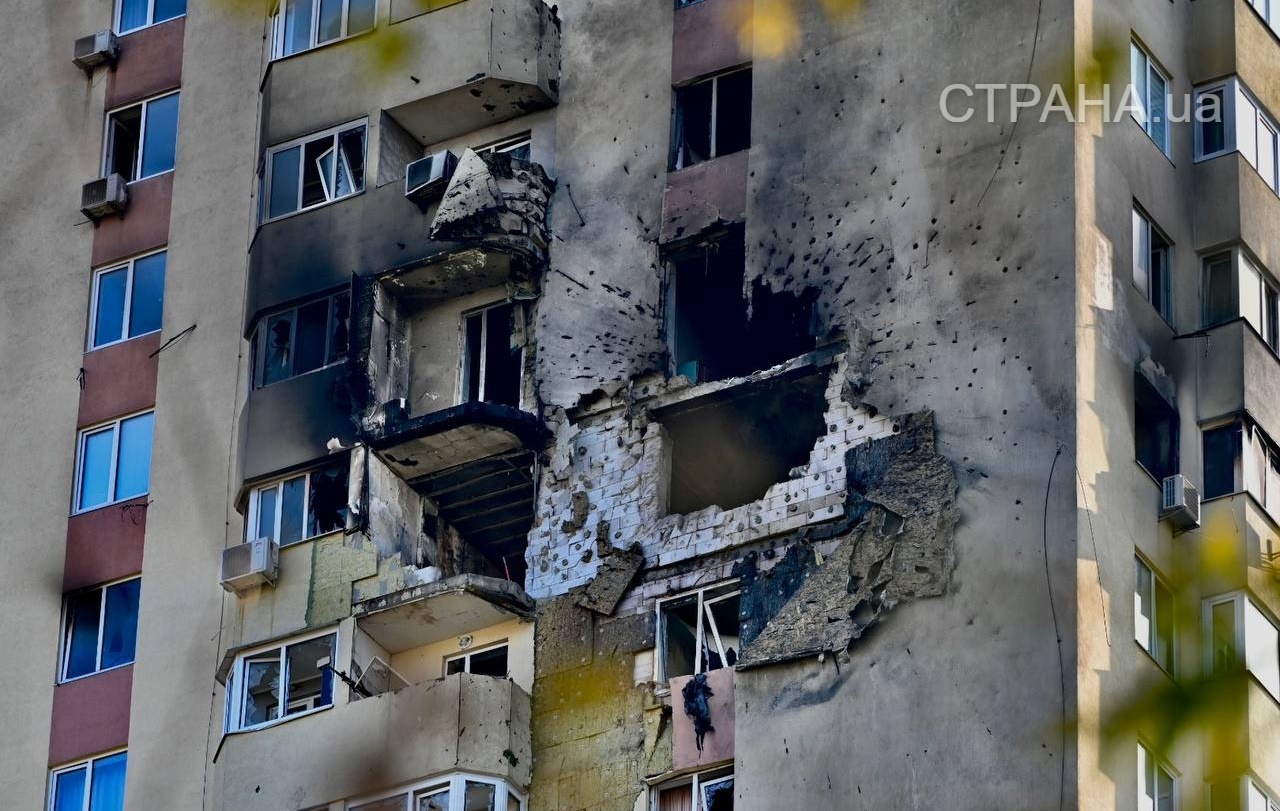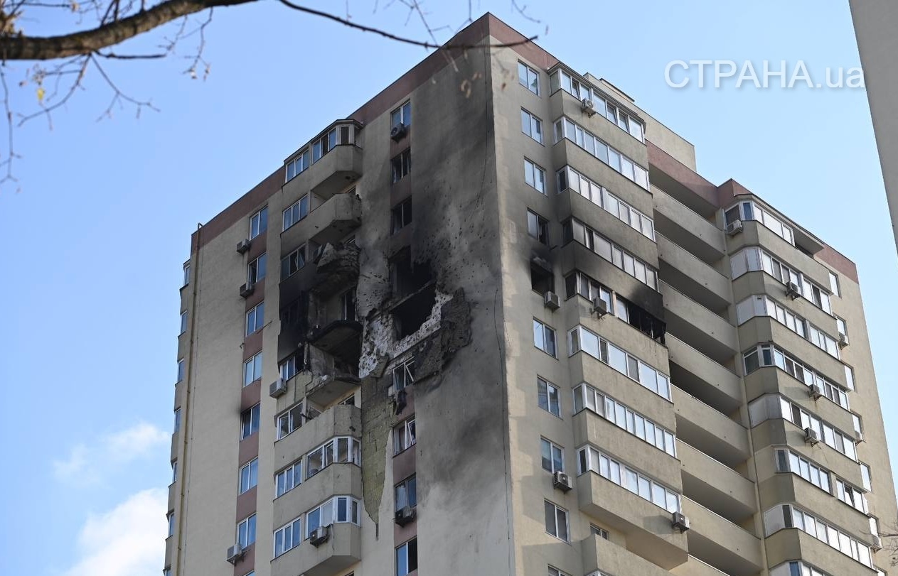 08:37 Так зранку виглядає будинок у Солом'янському районі Києва, куди вчора увечері потрапив "Шахед".