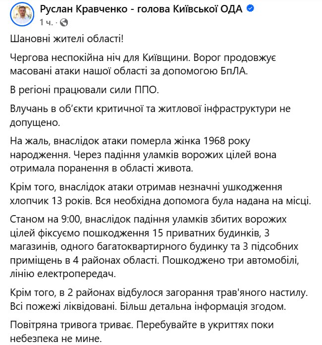 Цієї ночі Київщину росіяни атакували ударними БПЛА. Загинула жінка. Пошкоджено житлові будинки.