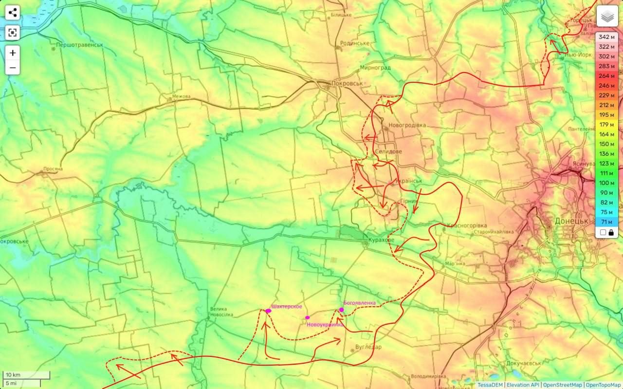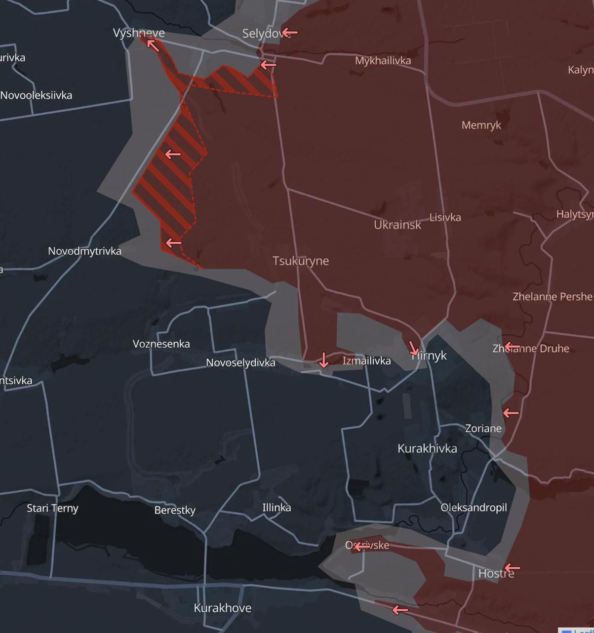 Про наступ на Новодмитрівку повідомляють і російські пабліки. Вони заявляють про просування до двох кілометрів з півночі на південь трасою від Вишневого. Мета, як заявляється - вийти з північного заходу до тилу угруповання ЗСУ у Кураховому та всього району на південь від нього.