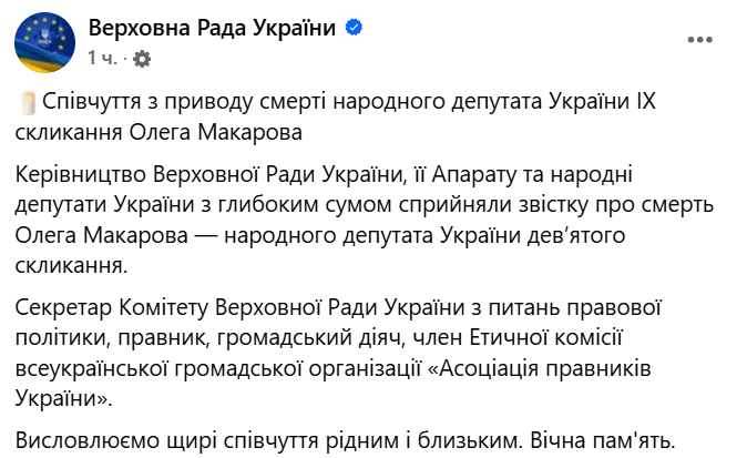 "Керівництво Верховної Ради України, її Апарату та народні депутати України з глибоким сумом сприйняли звістку про смерть Олега Макарова - народного депутата України дев'ятого скликання", - йдеться у повідомленні.