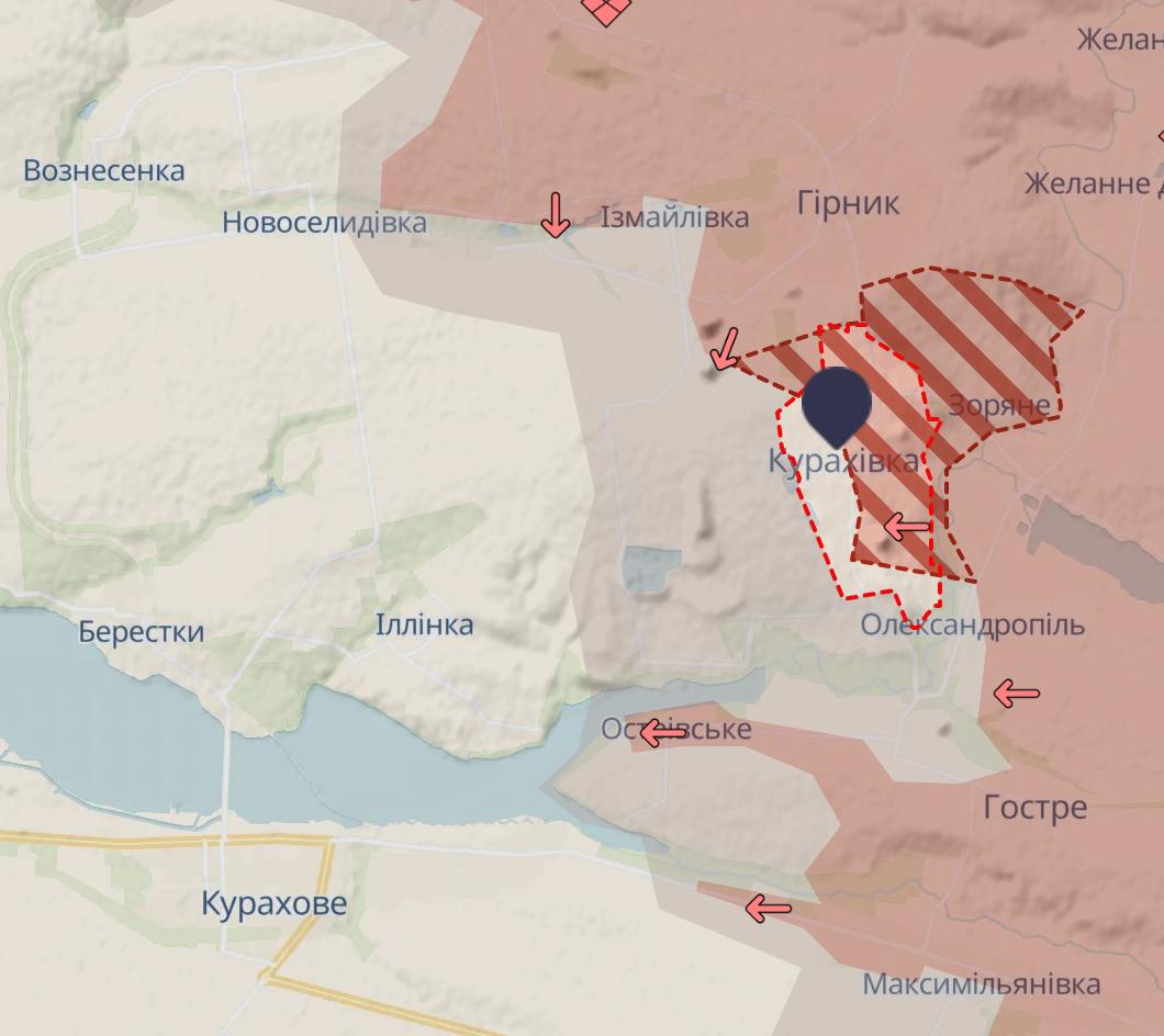 Карта Deep State підтверджує суттєве просування росіян на цій ділянці та повне захоплення сусіднього Зоряного. По Курахівці вказано, що половина селища знаходиться в сірій зоні, яка тягнеться далеко на захід, прямо до підступів Іллінки.