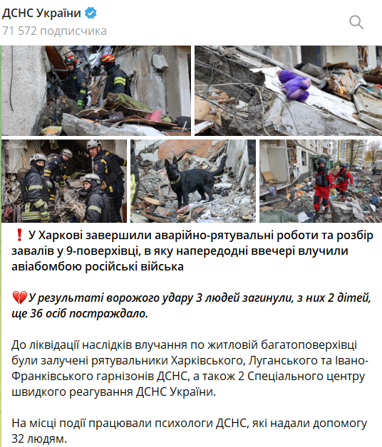 У Харкові завершили розбір завалів у багатоповерховому житловому будинку, до якого напередодні потрапила авіабомба. Підсумкова цифра – троє загиблих, у тому числі двоє дітей. Постраждали 36 людей.