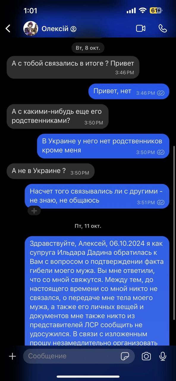 "Ільдар мені розповів, що у нього конфлікти з командуванням ЛСР через те, що в результаті їхніх піар-акцій (наприклад, у Тьоткіно) безглуздо гинули його побратими. Ще він додав, що через ці конфлікти він уже побоюється кулі в спину. 26 жовтня в одному зі ЗМІ вийшла стаття, де побратими мого чоловіка підтвердили, що у чоловіка були конфлікти в ЛСР. Постійно змінювалися версії, як загинув мій чоловік: то внаслідок артобстрілу, то внаслідок атаки дрона, а кілька днів тому ЛСР офіційно заявив, що Ільдар загинув унаслідок автоматного вогню. А тепер вони кремували його тіло і поховали порох, і я починаю все більше й більше сумніватися в тому, що Ільдар загинув саме від рук окупантів, а не отримав кулю в спину", - написала Олександра.