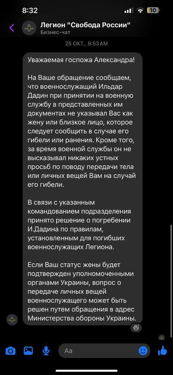 Вдова росіянина Ільдара Дадіна, який воював за Україну і загинув, мешканка Києва та громадянка України Олександра Свєчникова заявила, що його могли вбити товариші по службі з "Легіону Свобода Росії" (ЛСР) внаслідок конфлікту.