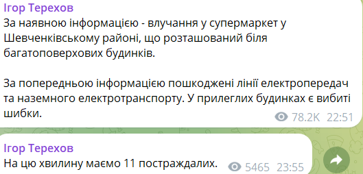 За його словами, попередньо постраждали 11 людей. Зафіксовано приліт супермаркетом, який розташований біля багатоповерхових будинків. У будинках вибито скло, пошкоджено електромережі.