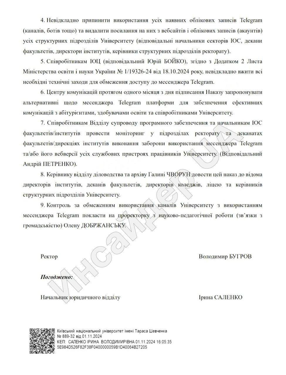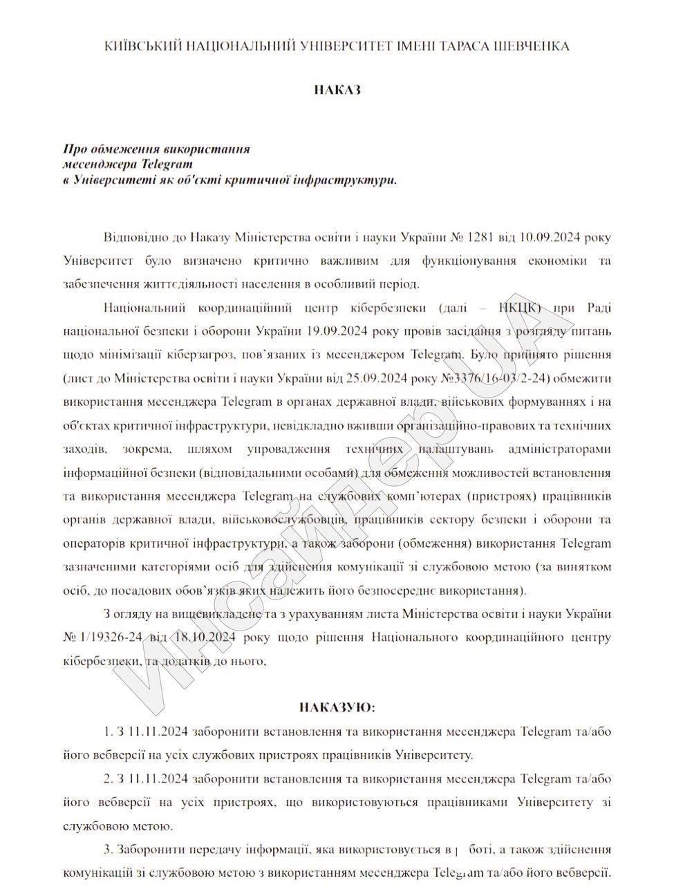 У наказі Бугров посилається на наказ Міністерства освіти і науки від 10 вересня, яким КНУ визнається критично важливим для функціонування економіки, а також на рішення Національного координаційного центру кібербезпеки щодо обмеження використання Телеграма в органах державної влади та на об'єктах критичної інфраструктури. На підставі цих документів ректор заборонив встановлювати та використовувати Телеграм на службових гаджетах та комп'ютерах, а також на пристроях, які використовуються у службових цілях.