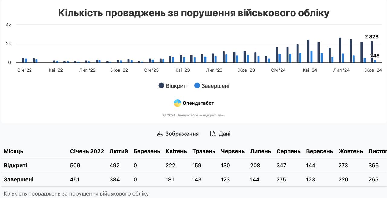 За інформацією сервісу, який посилається на статистику Міністерства юстиції, за 10 місяців 2024 року в Україні було відкрито 21 336 проваджень за порушення правил військового обліку, що вдвічі більше, ніж за весь 2023 рік (тоді у реєстрі було зафіксовано 10 542 провадження). При цьому лише 39% прострочених штрафів було сплачено – тобто українці погашають лише кожен третій прострочений штраф.