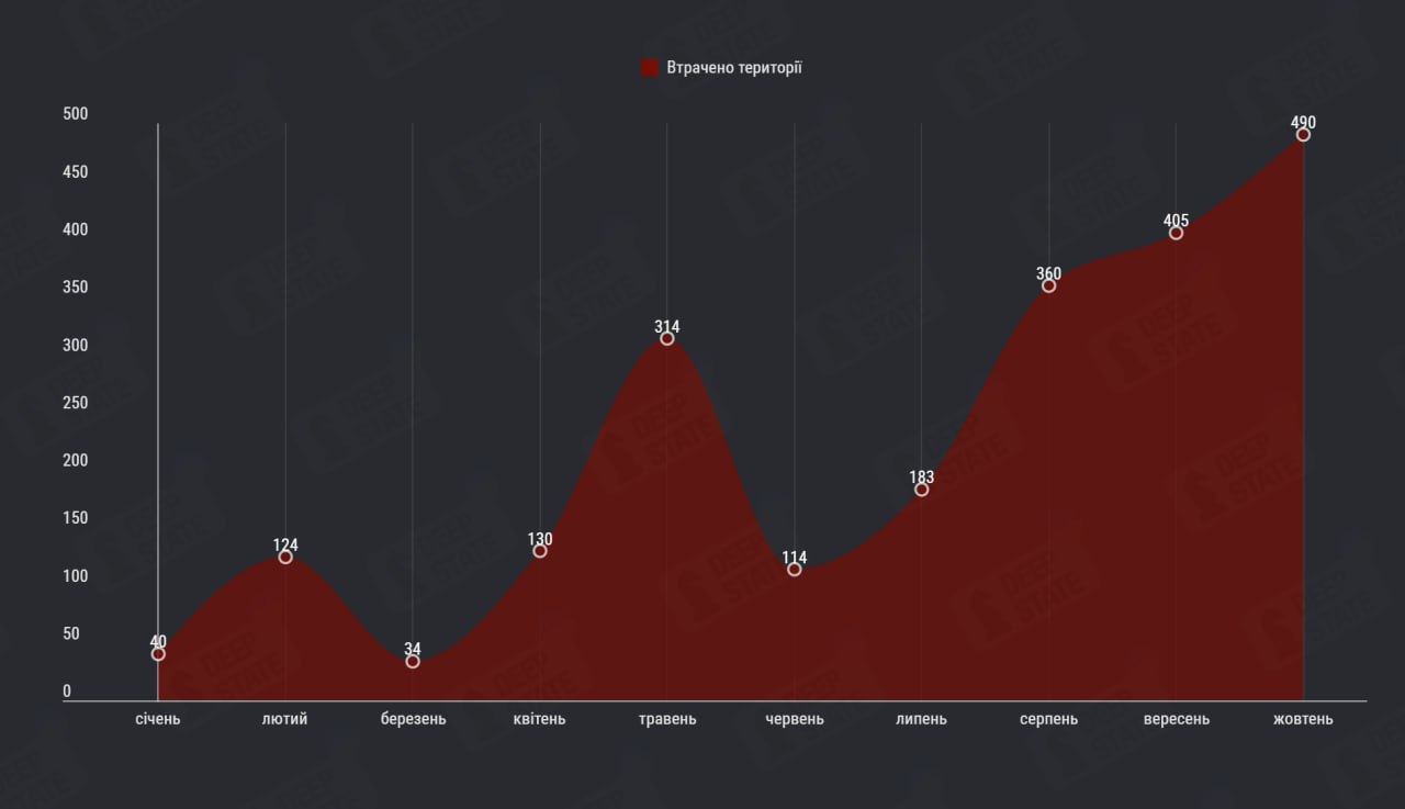 За жовтень армія РФ захопила близько 490 кв. км територій України, повідомляє Deep State. Це найбільший показник цього року і від початку російської наступальної операції, яка розпочалася у жовтні 2023 року.