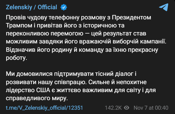 "Провів чудову телефонну розмову з президентом Трампом і привітав його з історичною та переконливою перемогою - цей результат став можливим завдяки його вражаючій виборчій кампанії. Відзначив його родину й команду за їхню прекрасну роботу. Ми домовилися підтримувати тісний діалог і розвивати нашу співпрацю. Сильне й непохитне лідерство США є життєво важливим для світу і для справедливого миру", - написав Зеленський.