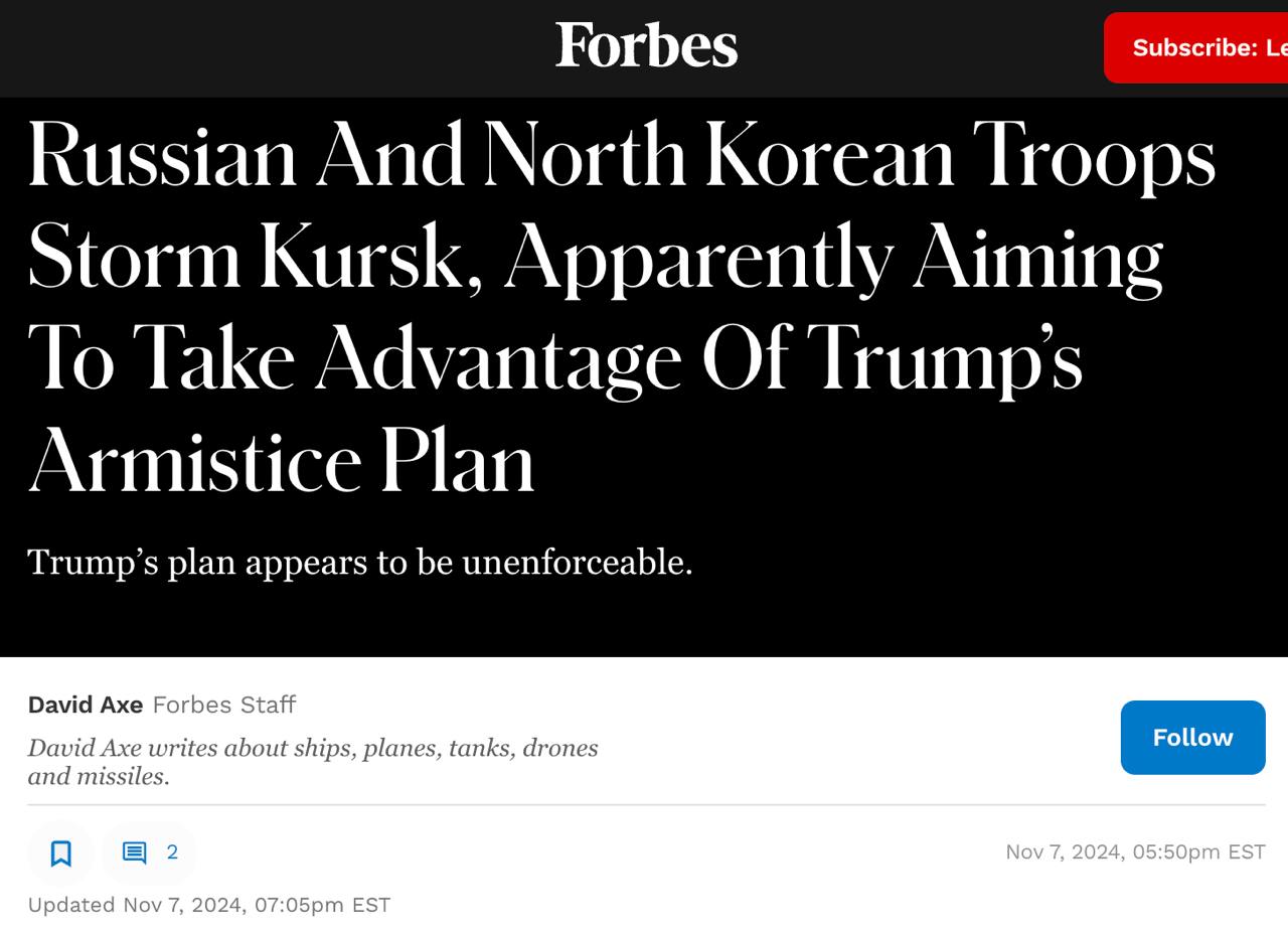За даними видання, у четвер російські морські піхотинці 810-ої бригади за підтримки північнокорейських підкріплень атакували лівий фланг Курського виступу, що закінчилося "кривавою лазнею для росіян".