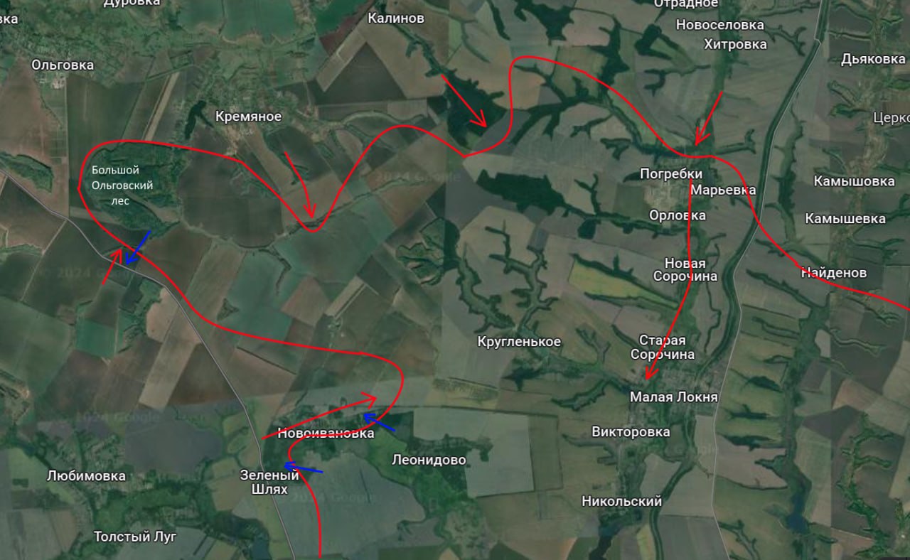 Але заявляють, що їм вдалося суттєво просунутися через Погребки та Старі Сорочини на південь у бік Малої Локні. Також вони атакують у районі Новоіванівки, що вказує на їхню спробу оточити українські підрозділи у північній частині курського плацдарму.