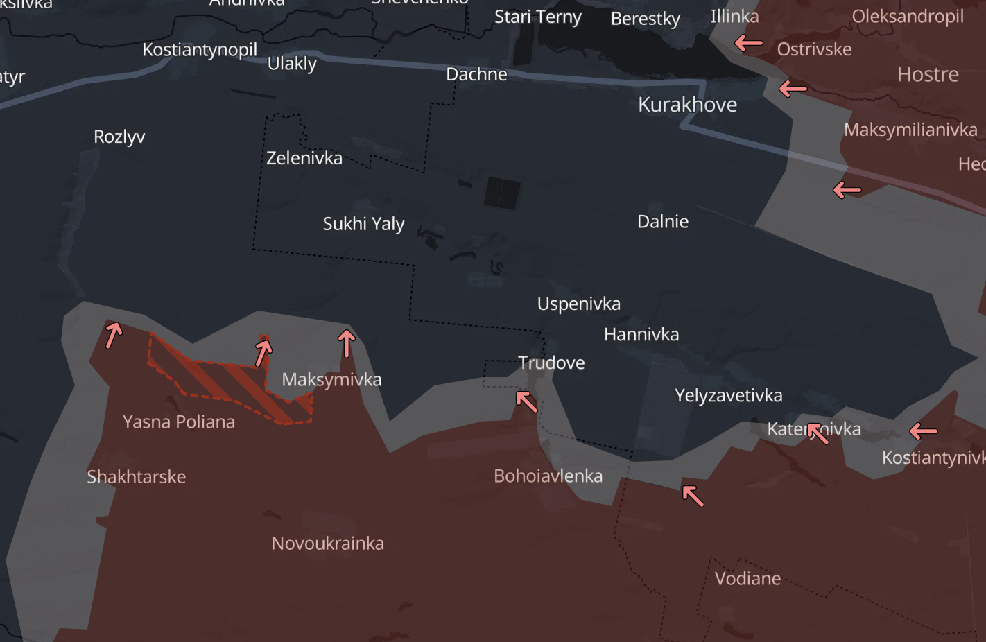 На південь від Курахового росіяни, за даними Deep State, продовжують просуватися на північ від Ясної Поляни у напрямку Сухих Ялів (хоча, нагадаємо, українські військові вже заявляли, що за Яли почалися бої).