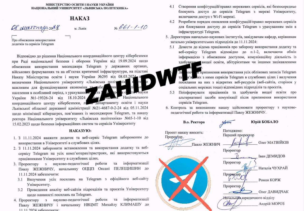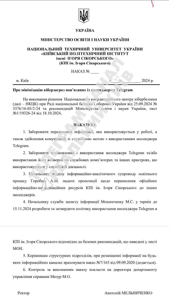 Тим часом в українських організаціях та вишах Телеграм продовжують забороняти використовувати у службових цілях. Нещодавно це зробили Національний університет "Львівська політехніка" та Київський політехнічний інститут імені Ігоря Сікорського, про що свідчать відповідні накази їхніх ректорів, опубліковані у мережі.