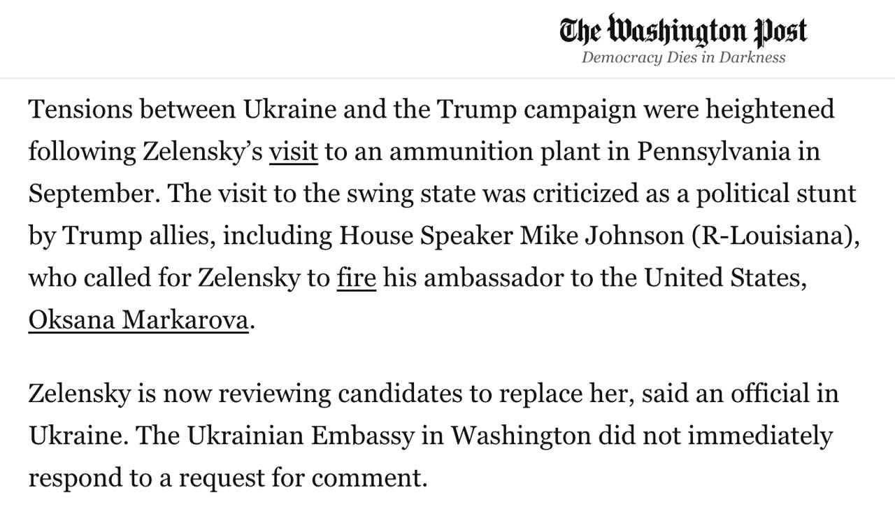"Напруженість між Україною і командою Трампа посилилася після візиту Зеленського на завод з виробництва боєприпасів у Пенсільванії у вересні. Прихильники Трампа, включаючи спікера Палати представників Майка Джонсона, який закликав Зеленського звільнити посла в США Оксану Маркарову, розкритикували візит у штат, що коливається, як політичний трюк. Зеленський зараз переглядає кандидатів на її заміну, сказав чиновник в Україні", – йдеться у статті.