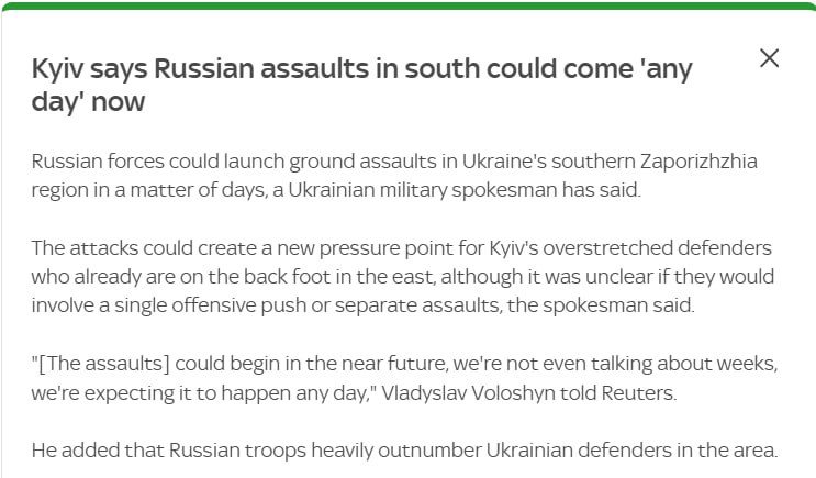 У свою чергу, спікер Сил оборони півдня Владислав Волошин заявив, що росіяни можуть розпочати штурми в Запорізькій області протягом декількох днів, повідомляє Sky News.