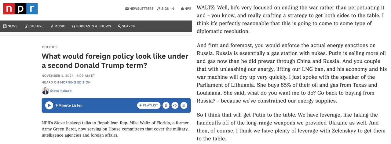 Конгресмен-республіканець із Флориди Майк Уолтц, якого ЗМІ називають майбутнім помічником Дональда Трампа з національної безпеки, незадовго до виборів розповідав в інтерв'ю, як його однопартієць у разі перемоги може змусити Україну та РФ укласти мирну угоду.