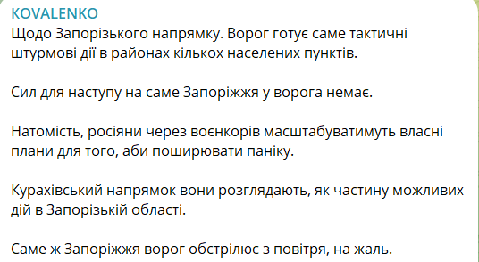 Також Коваленко пише, що "Курахівський напрямок вони (російські війська – Ред. ) розглядають як частину можливих дій у Запорізькій області".