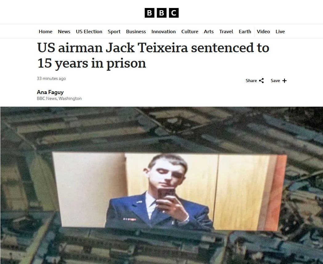 Суд у США засудив до 15 років в'язниці військовослужбовця ВПС Нацгвардії Джека Тейшейру, якого звинувачують у витоку секретних документів Пентагону по Україні.