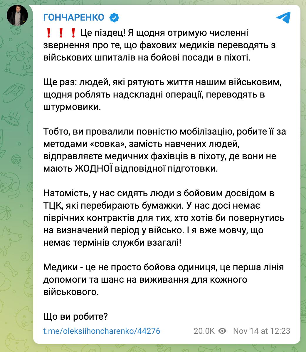 Гончаренко зазначає, що в той же час "у нас сидять люди з бойовим досвідом у ТЦК, які перебирають папірці" та "досі немає піврічних контрактів для тих, хто хотів би повернутися на певний період до армії".