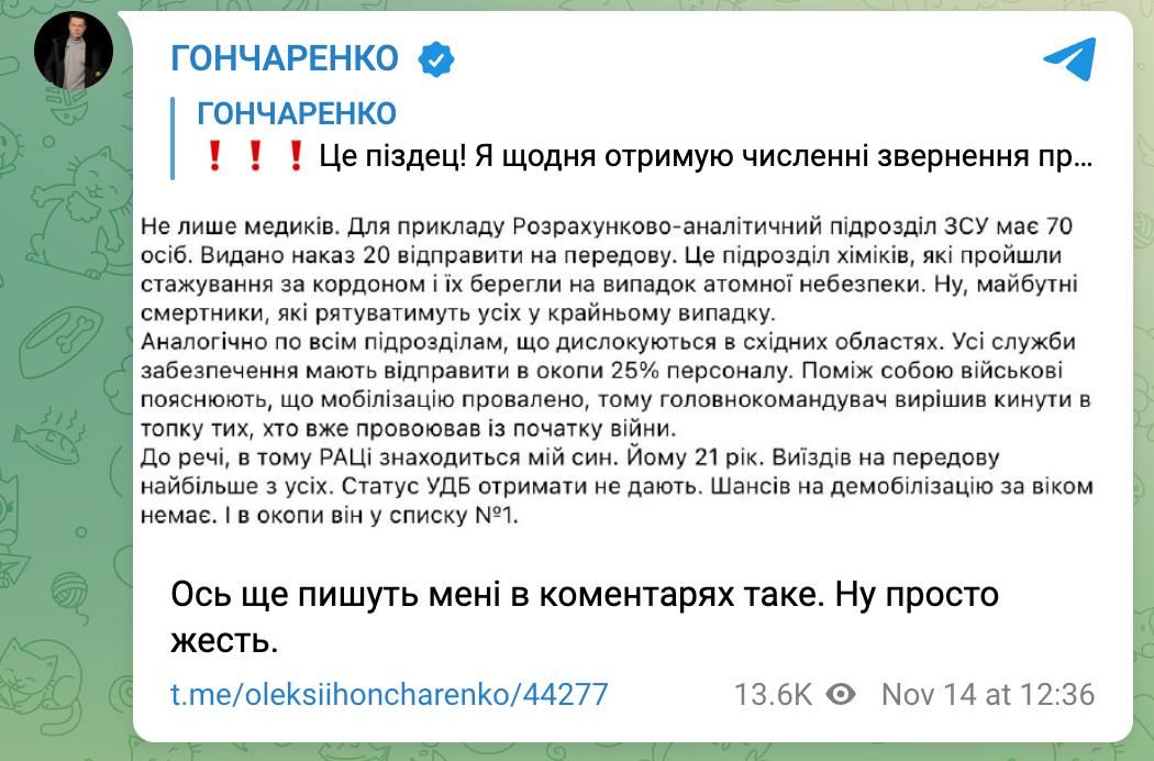 "Розрахунково-аналітичний підрозділ ЗСУ має 70 осіб. Видано наказ 20 відправити на передову. Це підрозділ хіміків, які пройшли стажування за кордоном та їх берегли на випадок атомної небезпеки. Ну, майбутні смертники, які рятуватимуть усіх у крайньому випадку. Аналогічно по всіх підрозділам, що дислокуються у східних областях. Усі служби забезпечення повинні відправити в окопи 25%. персоналу", - наводить депутат слова свого передплатника.