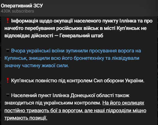 "Вчора українські воїни зупинили просування ворога на Куп'янськ, знищили всю його бронетехніку та ліквідували значну частину живої сили. Куп'янськ повністю під контролем Сил оборони України.