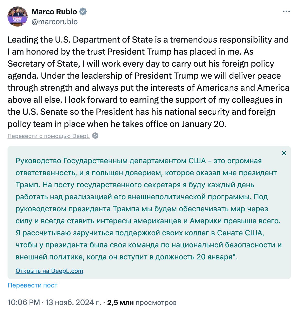 "На посаді державного секретаря я щодня працюватиму над реалізацією його зовнішньополітичної програми. Під керівництвом президента Трампа ми забезпечуватимемо світ через силу і завжди ставитимемо інтереси американців та Америки понад усе", - написав Марко Рубіо в Х.