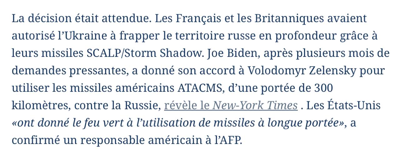 А газета Le Figaro, не наводячи подробиць, повідомляє, що "французи та британці слідом за США дозволили Україні вразити російську територію своїми далекобійними ракетами SCALP/Storm Shadow".
