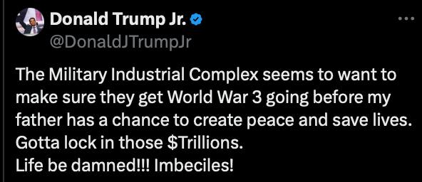 Треба заморозити ці трильйони доларів. Життя нікого не хвилюють! Імбецили!” – написав Трамп-молодший.
