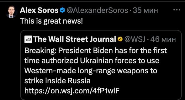 Також американський мільярдер Ілон Маск прокоментував повідомлення ЗМІ про рішення Байдена надати Україні дозвіл на "дальнобій".