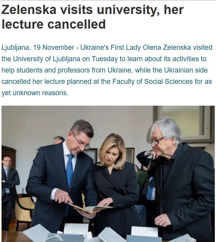 "Зеленська відвідала у вівторок університет у Любляні, щоб ознайомитися з його діяльністю за допомогою студентів з України, але українська сторона скасувала анонсований виступ на факультеті політичних наук із невідомих причин", - передає агентство.