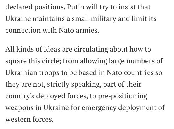 Зокрема, розглядається "дозвіл базуватися у великій кількості українських військ у країнах НАТО, щоб вони, строго кажучи, не були частиною розгорнутих сил своєї країни".