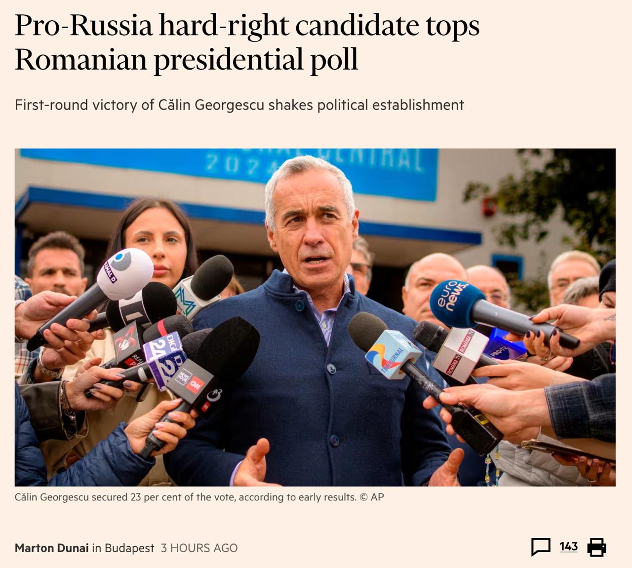 У Румунії у першому турі президентських виборів переміг "проросійський вкрай правий кандидат" Калін Джорджеску, який виступав проти допомоги Україні.