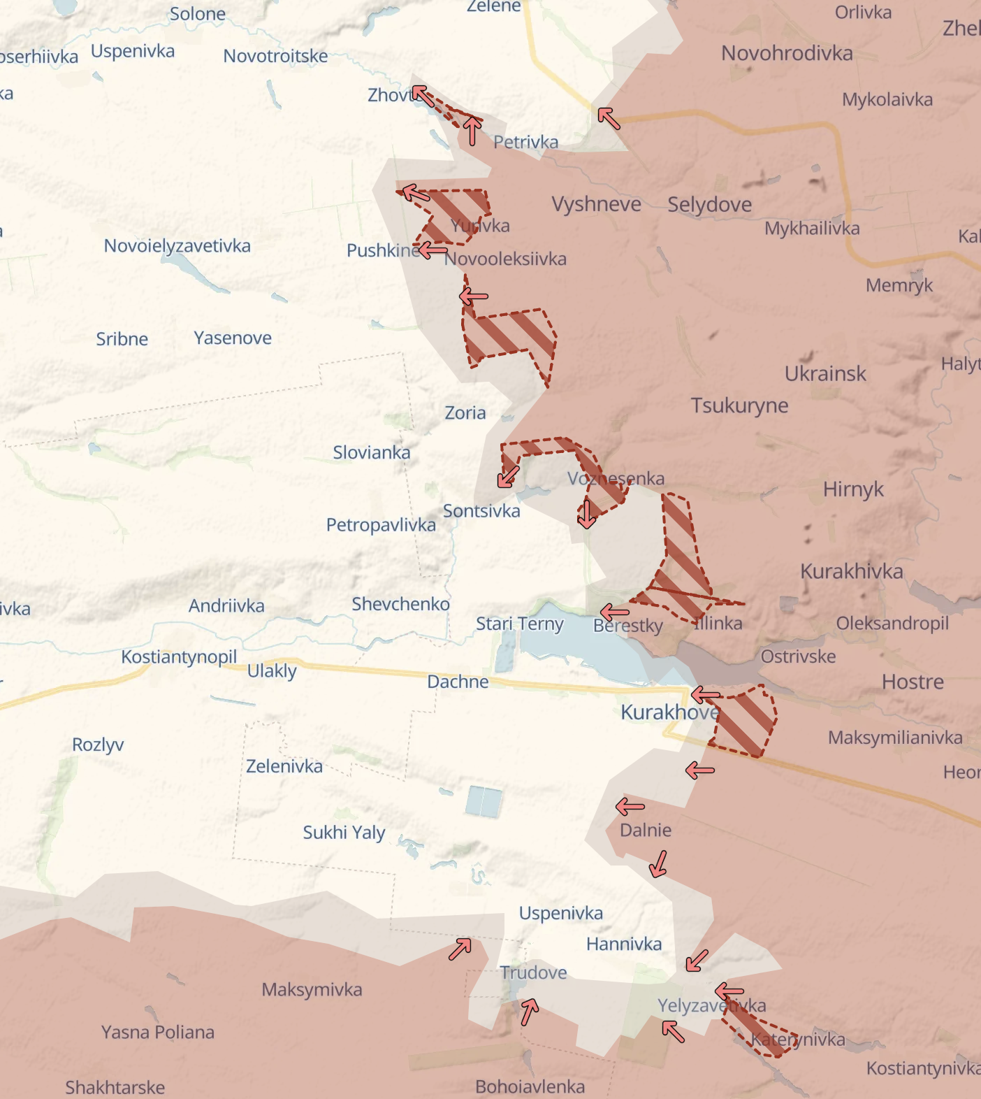 Цілий ряд просувань у РФ був на фронті від Покровська до Курахового Росіяни просунулися на південь від Покровська, почавши обхід міста з цієї сторони.