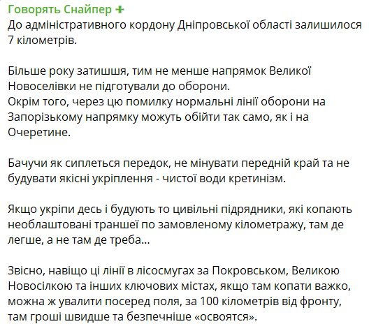 "До адміністративного кордону Дніпропетровської області залишилося 7 км. Більше року затишшя, проте напрям Великої Новосілки не підготували до оборони. Крім того, через цю помилку нормальні лінії оборони на Запорізькому напрямку можуть обійти так само, як і на Очеретино", - Написав він.
