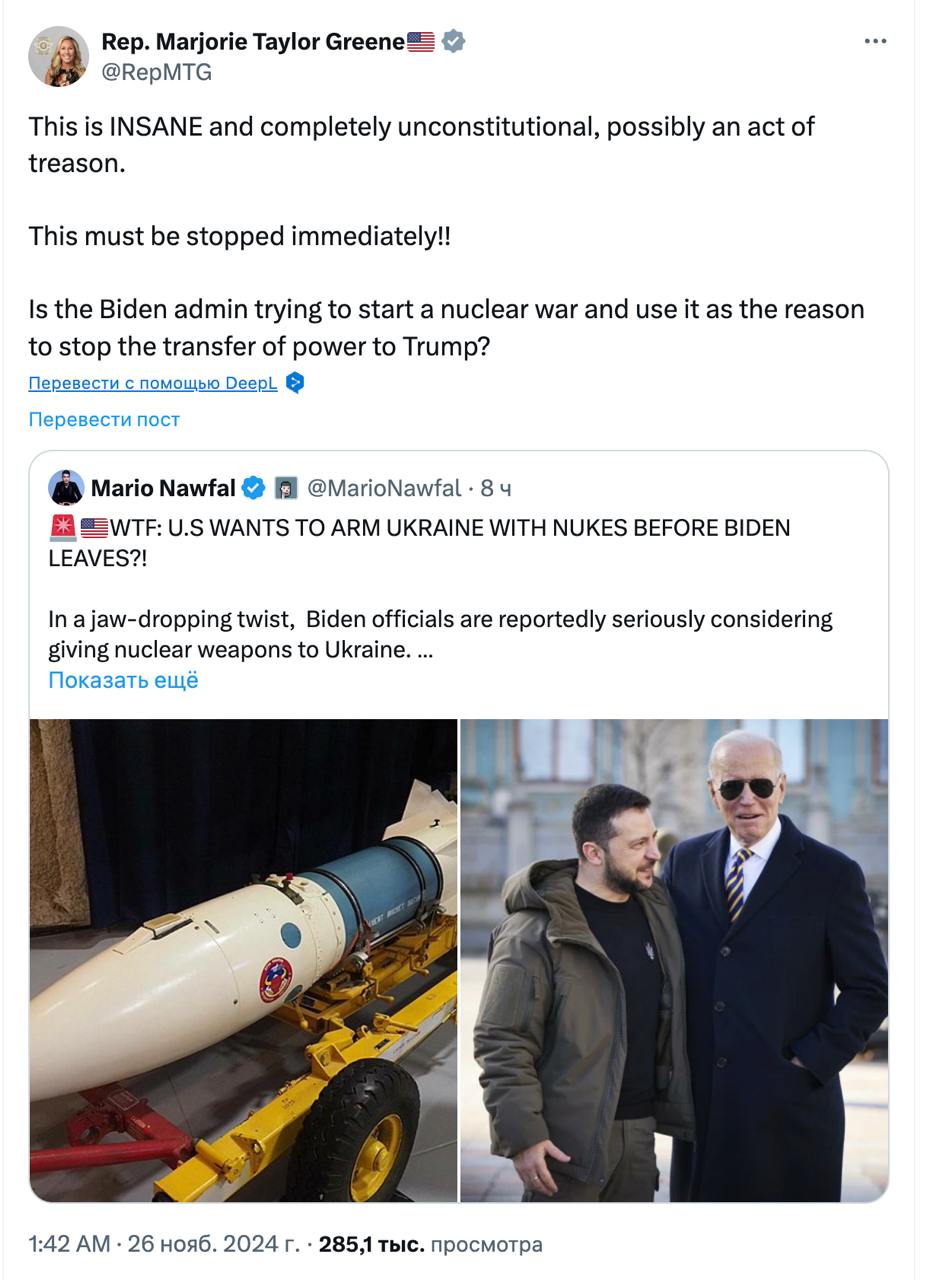 "Це божевілля та повна неконституційність, можливо, акт державної зради. Це має бути негайно зупинено! Адміністрація Байдена намагається розв'язати ядерну війну та використати її як причину, щоб зупинити передачу влади Трампу?" - написала Тейлор Грін у соцмережі X.