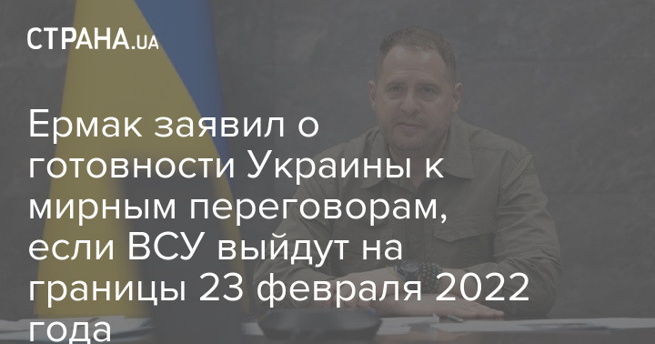 Глава офісу президента Андрій Єрмак заявив, що Україна готова до мирних переговорів за умови, якщо її війська вийдуть на кордони 23 лютого 2022 року.