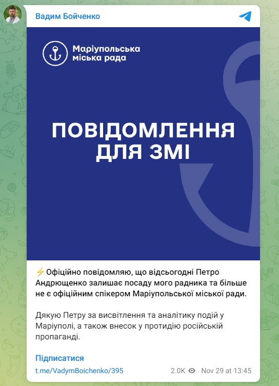 "Офіційно повідомляю, що з сьогоднішнього дня Петро Андрющенко залишає посаду мого радника і більше не є офіційним спікером Маріупольської міської ради. Дякую Петру за висвітлення та аналітику подій у Маріуполі, а також внесок у протидію російській пропаганді", - сказано у пості.