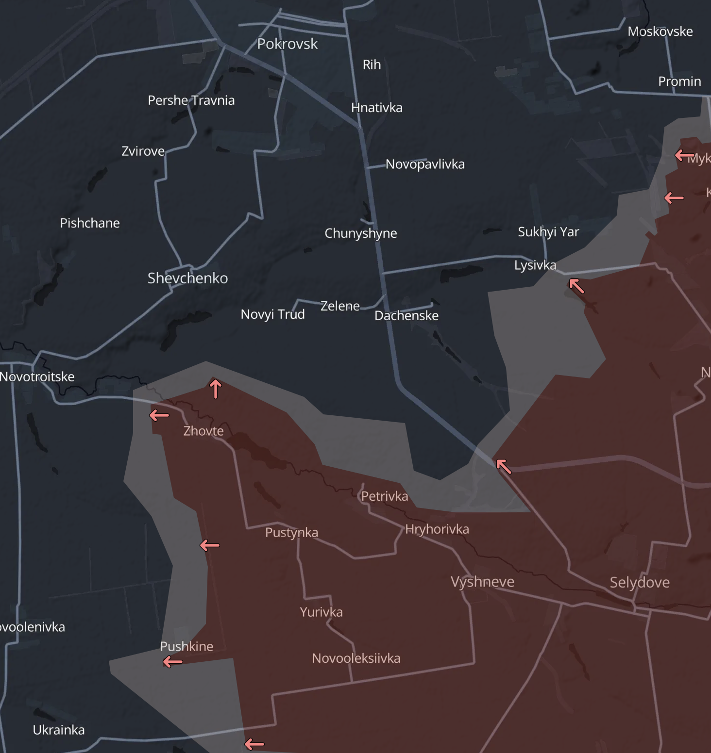 На північ від росіяни продовжують відносно швидко просуватися на південь від Покровська. Вони наблизилися до населених пунктів, через які йде дорога у напрямку Курахового – Шевченка, Новотроїцького та Новоєленівки.