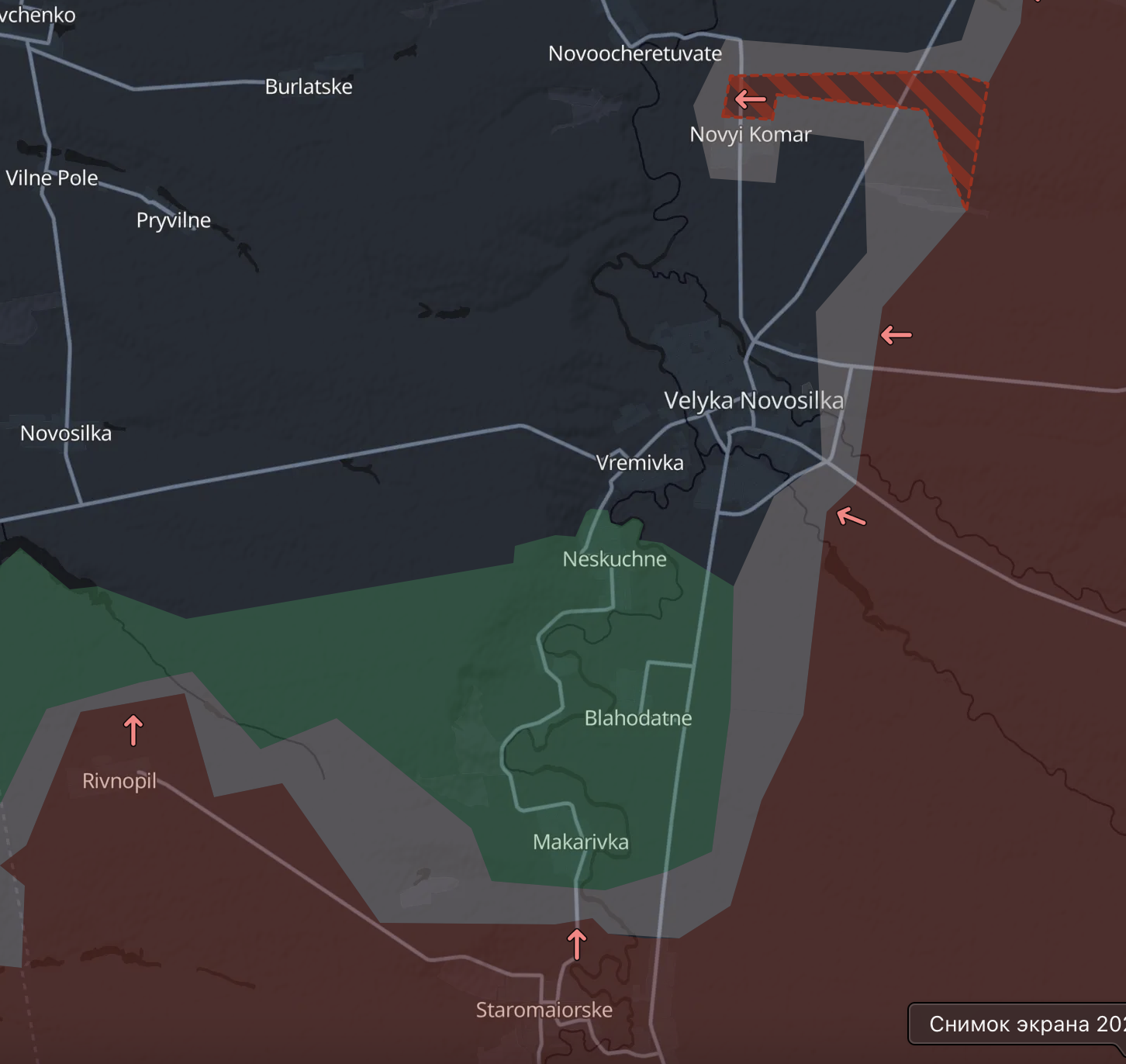 У районі Великої Новосілки російські війська прорвалися до населеного пункту Новий Комар. Це фактично блокує місто із північного боку, якщо Новий Комар вдасться захопити. Поки що, за даними військового паблика Deep State, йдуть спроби вибити росіян звідти.