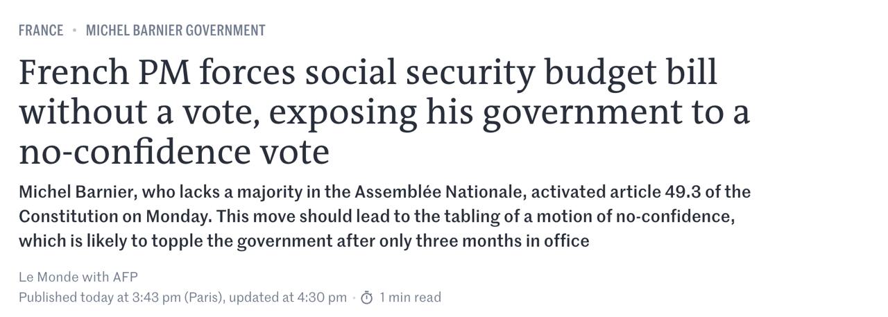 За її інформацією, партія Марін Ле Пен "Національне об'єднання" заявила, що підтримає вотум недовіри уряду Мішеля Барньє. Причиною є проведення Кабміном законопроекту про бюджет соціального страхування на 2025 рік в обхід депутатів.