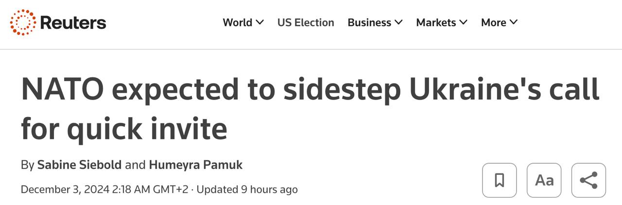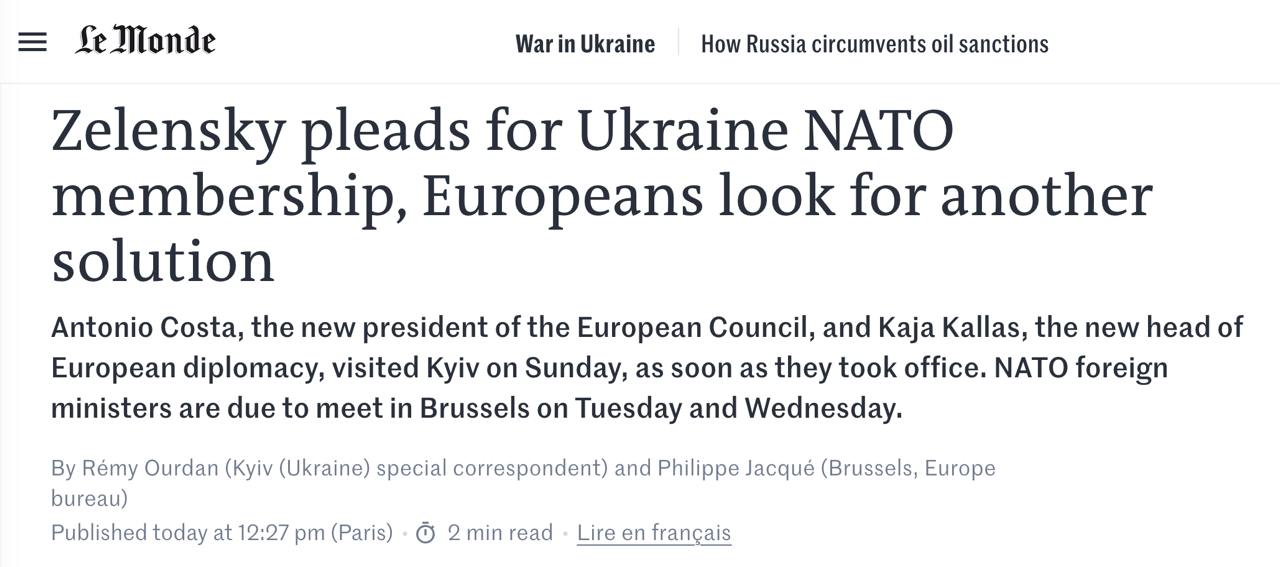 Володимир Зеленський "змінює свою риторику", говорячи про готовність припинити війну по лінії фронту в обмін на запрошення до НАТО. Однак запрошення до Альянсу зараз малоймовірне: чиновники у Вашингтоні, Берліні та інших столицях "стурбовані тим, що зближення України з Альянсом може загострити конфронтацію Заходу з Москвою".