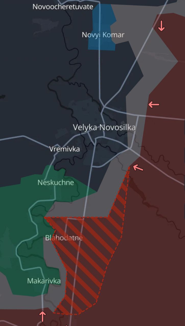 Крім того, росіяни просунулися на південь від Великої Новосілки, захопивши, за даними українських військових, село Благодатне. Воно було звільнено Україною під час контрнаступу влітку 2023 року.