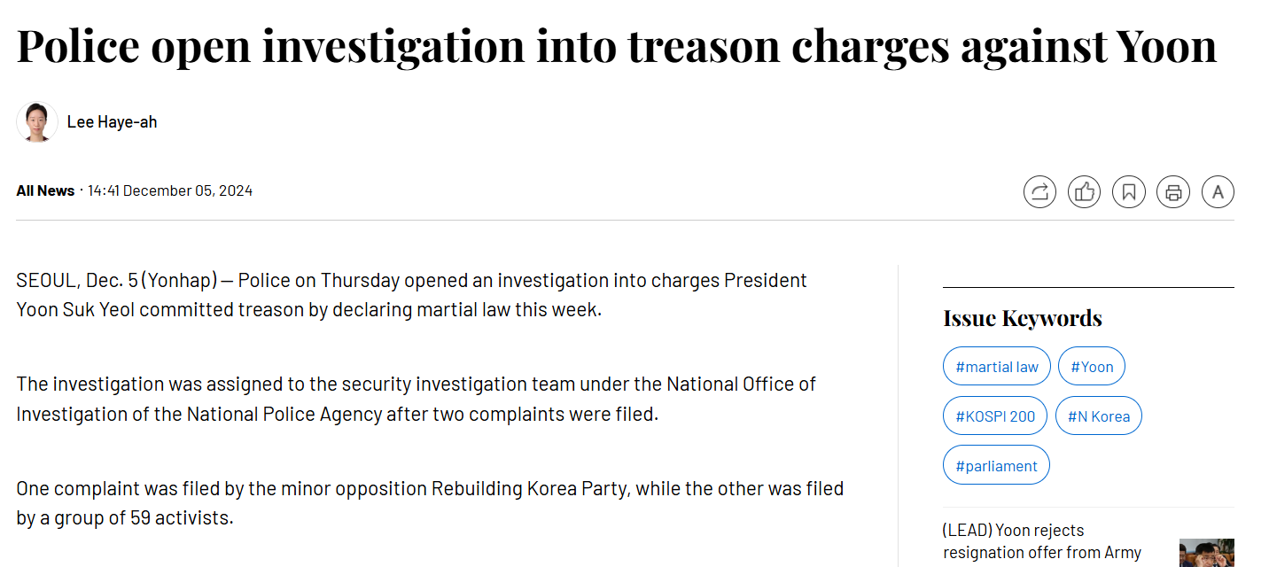Поліція Південної Кореї розпочала розслідування стосовно президента Юн Сок Йоля у справі про державну зраду.