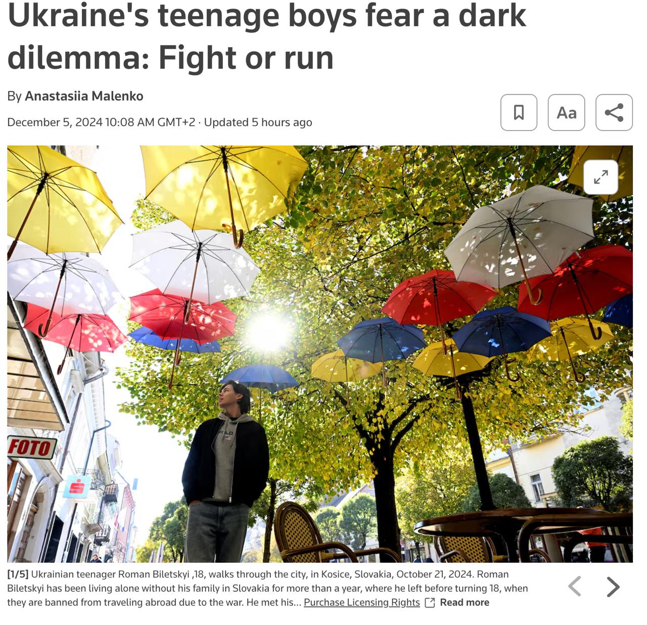 У Reuters зазначили, що поспілкувалися з напівдюжиною молодих українців, а також із родичами, офіцерами з набору в армію та посадовими особами, і все вказує на похмуру дилему, з якою стикаються тисячі хлопців та їхні сім'ї з наближенням дорослішання: залишатися чи їхати? Хоча більшість залишаються залишати батьківщину, деякі все ж таки зважилися вирушити за кордон, щоб уникнути перспективи поранення чи смерті в окопах, коли "Росія має перевагу, а Україна відчайдушно намагається поповнити свої виснажені та старіючі лави".