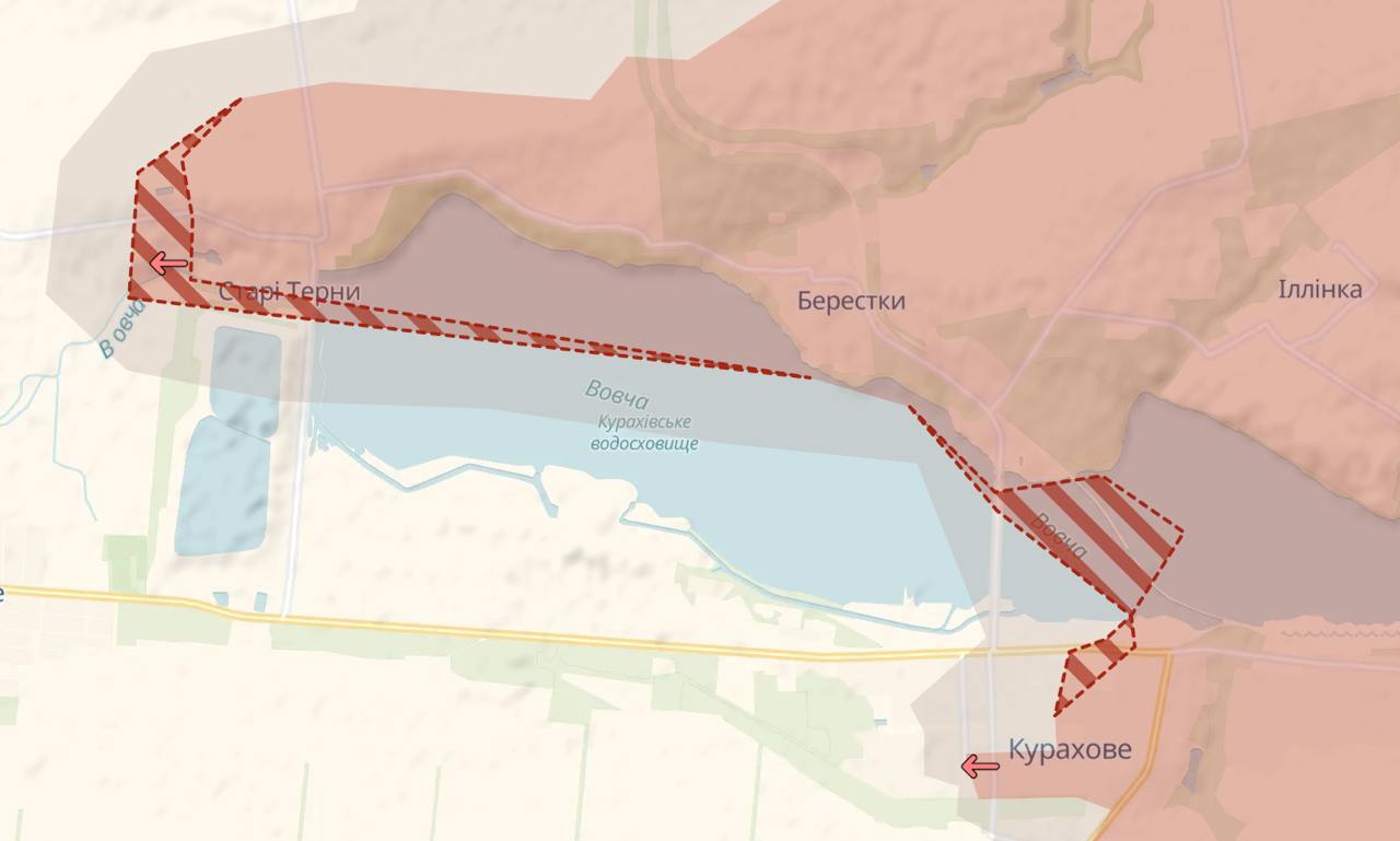 Карта українського військового пабліку Deep State підтверджує втрату Старих Тернів під Кураховим у Донецькій області. А також різке просування росіян у "кишені" на південь - на Успенівку.