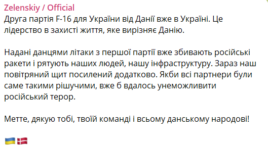 "Друга партія F-16 для України від Данії вже в Україні. Це лідерство в захисті життя, яке відрізняє Данію", - написав він.