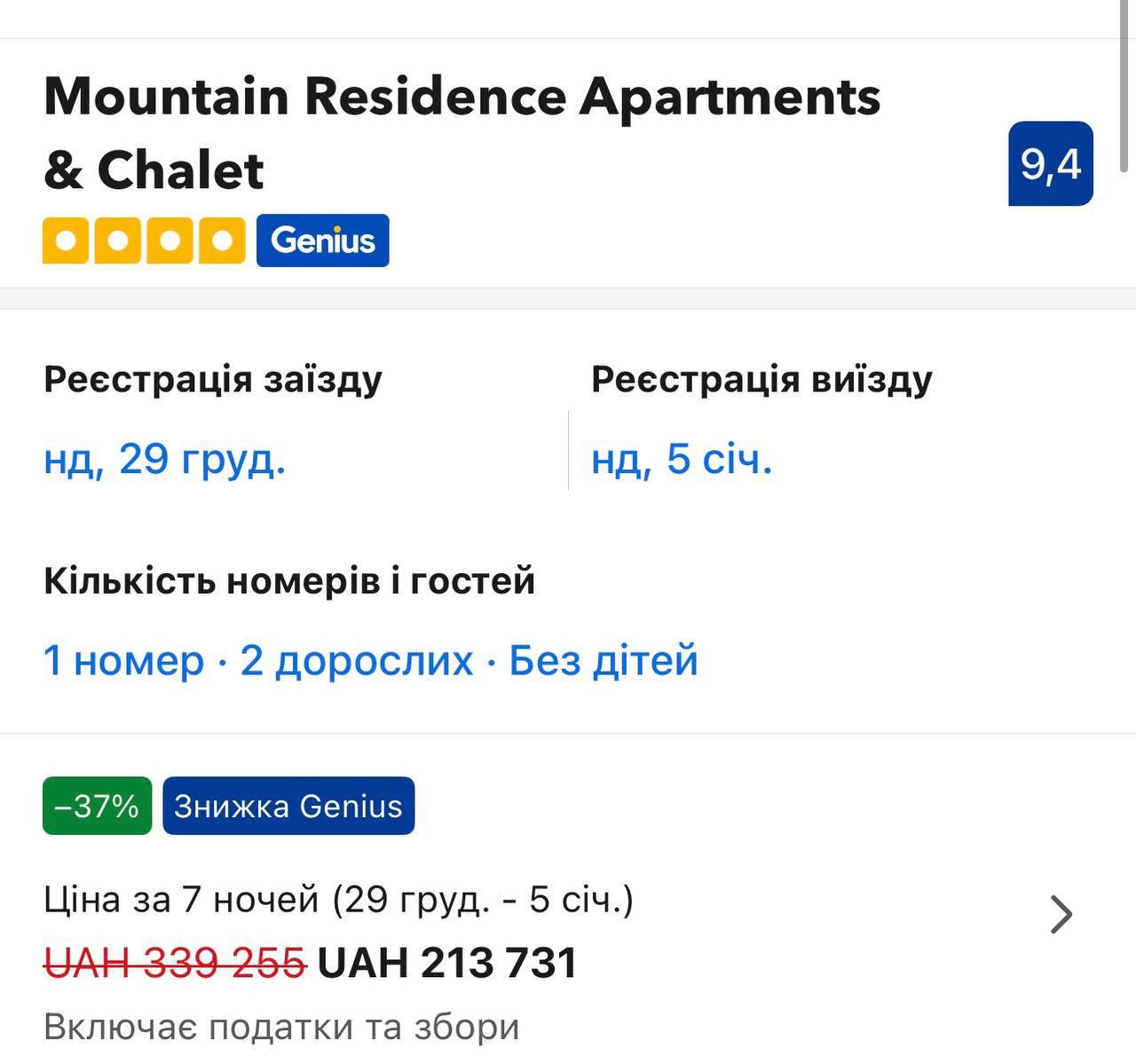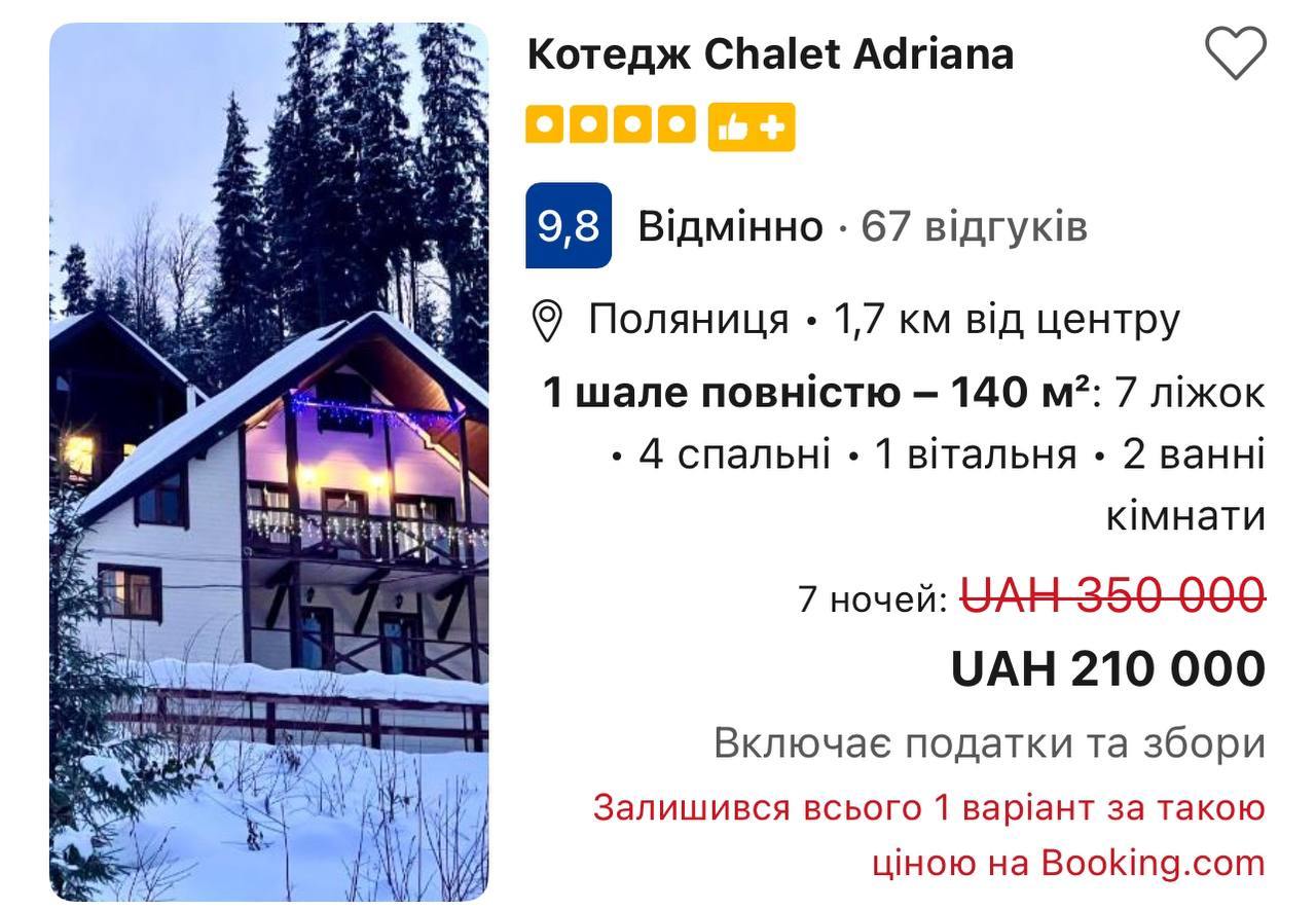 Оренда шале не дешевше за готелі. Наприклад, шале Chalet Adriana обійдеться в 350 000 гривень за 7 ночей без знижки і 210 000 гривень зі знижкою.