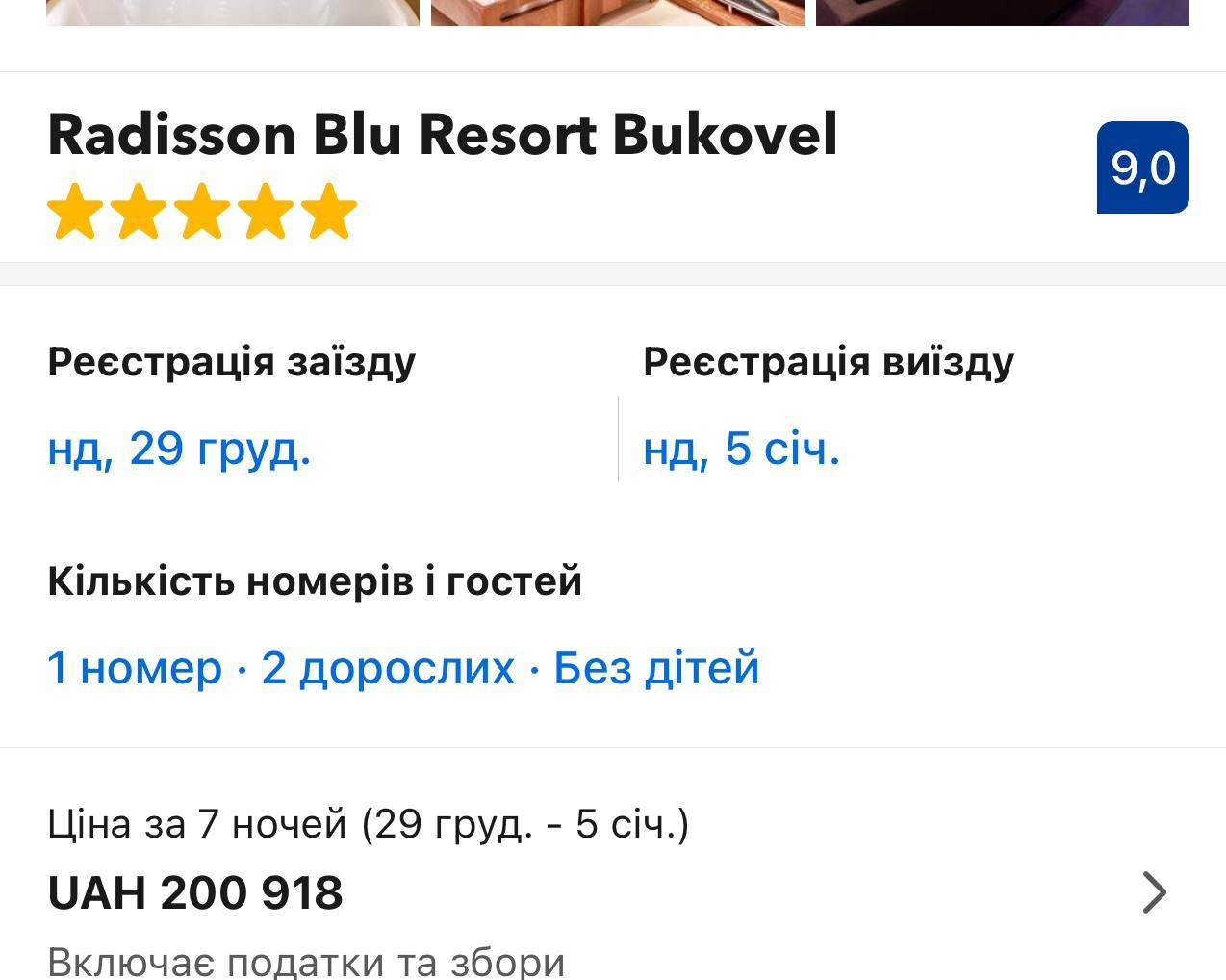 Так, вартість семиденного проживання у готелі Radisson Blu Resort Bukovel на двох становить 200 918 гривень.